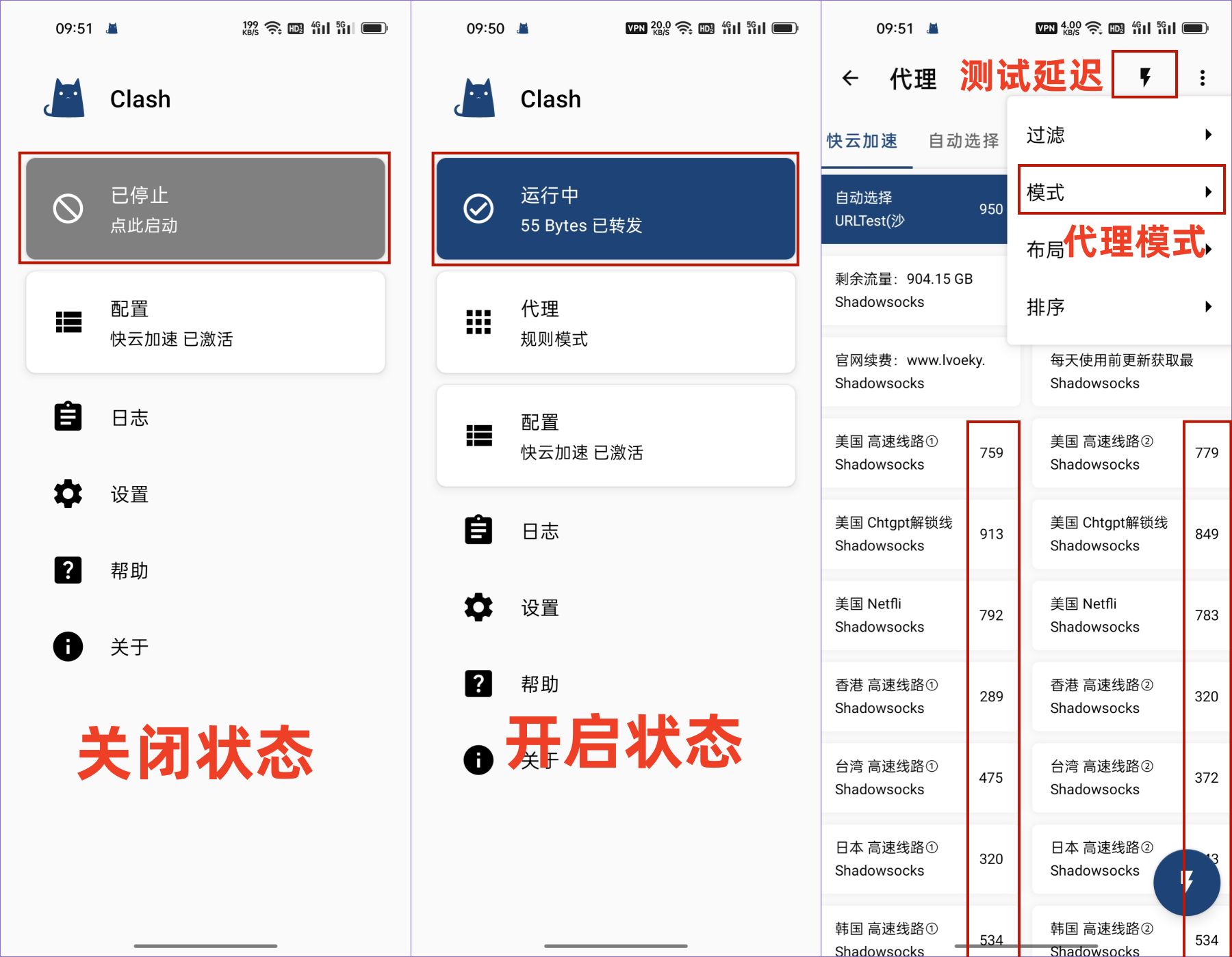 ### ==华为鸿蒙系统先退出纯净模式在安装== ### ==打开手机设置–系统和更新–关闭纯净模式== ## 第一步、注册快云加速账号购买订阅套餐 <div class="mrdoc-fragment" data-fragid=1>[片段]官方</div> ### 注册登录快云加速账号登录上去,点击左上角三条杠,点击购买订阅,选择合适自己的套餐订阅下单即可!(已注册购买的忽略)  --- ## 二、下载客户端 ## [下载安卓Clash](https://app.kuai-yun.com/Clash.apk) ## 三、官网导入订阅地址(==跳出弹窗全部点允许==) <div class="mrdoc-fragment" data-fragid=1>[片段]官方</div>  ### ①如果自动导入不成功,请复制订阅链接导入(如下图)  ## 四、打开开关 连接网络 #### 选择有延迟的线路(如果线路质量不好就换个线路使用) #### ==chatgpt需要开启全局代理模式==
