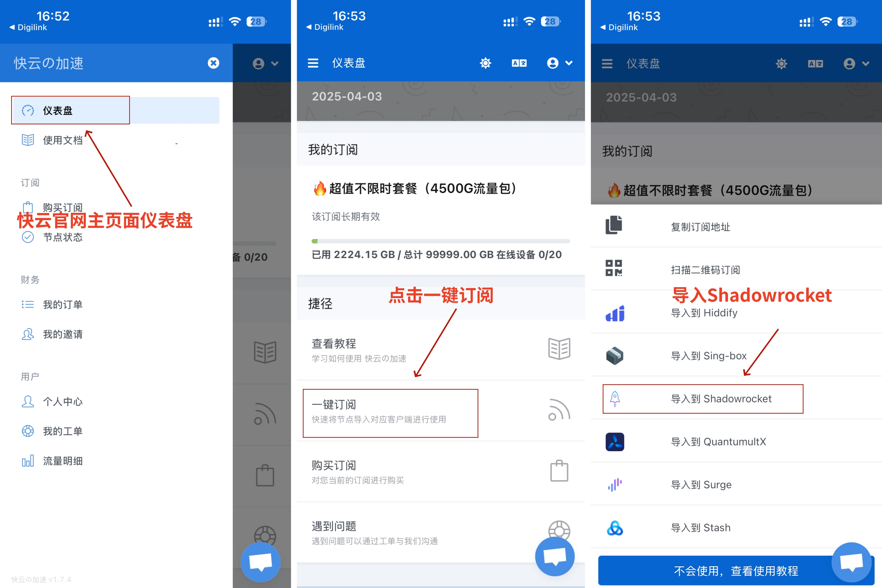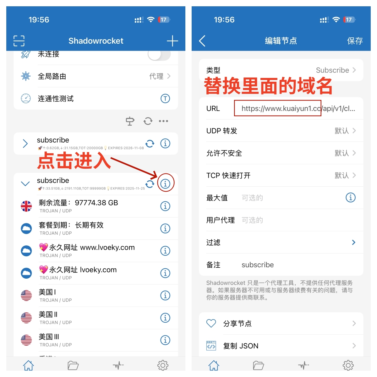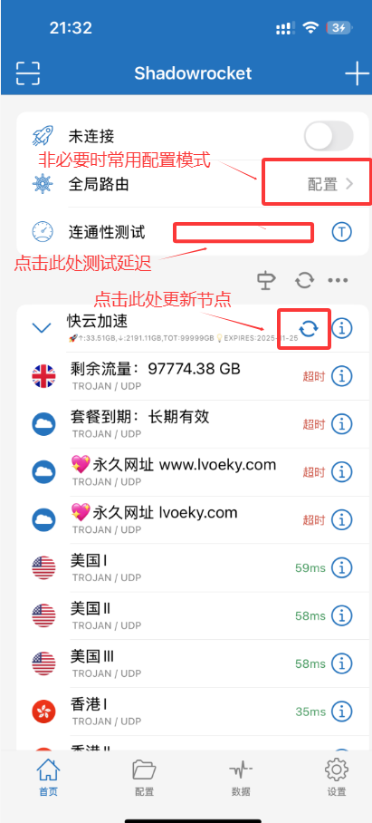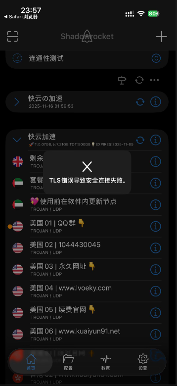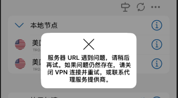 # ==问题①== ### 点击更新节点 提示服务器URL遇到问题 说明订阅信息过期需要重新导入订阅信息 更新节点并测试延迟(点击连通性测试) ==操作以下步骤时不要打开软件开关==   ### 解决办法 本机一键导入 #### 快云加速网站主页面仪表盘 一键订阅 导入到Shadowrocket <div class="mrdoc-fragment" data-fragid=1>[片段]官方</div>  ### 解决办法 其它设备使用订阅地址导入 #### 使用订阅地址导入  # ==问题②== ### 导入订阅信息提示tls错误导入安全连接失败及ssl错误连接失败  ### 解决办法 出现这种问题说明订阅地址的域名被墙 更换订阅地址的域名==操作以下步骤时不要打开软件开关== (如果还不能使用不会操作联系客服寻求帮助) ==永久地址里会更新最新的域名== <div class="mrdoc-fragment" data-fragid=1>[片段]官方</div>
