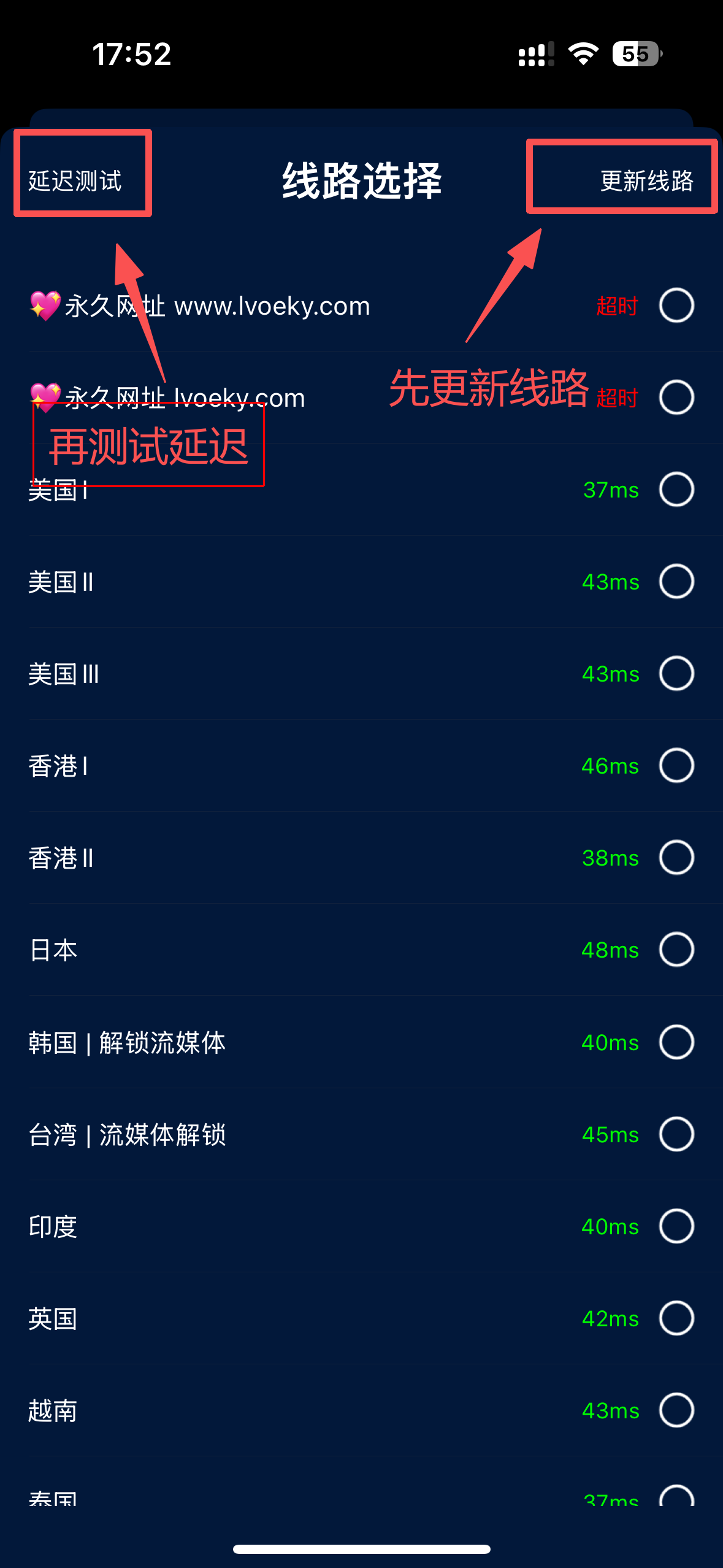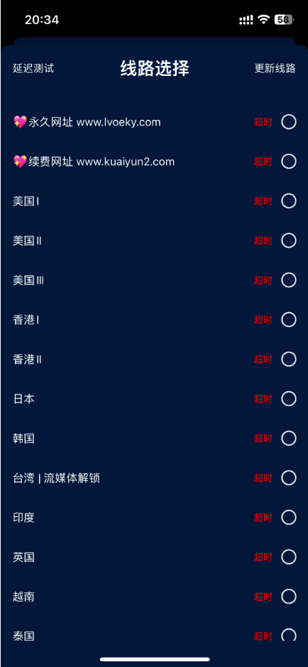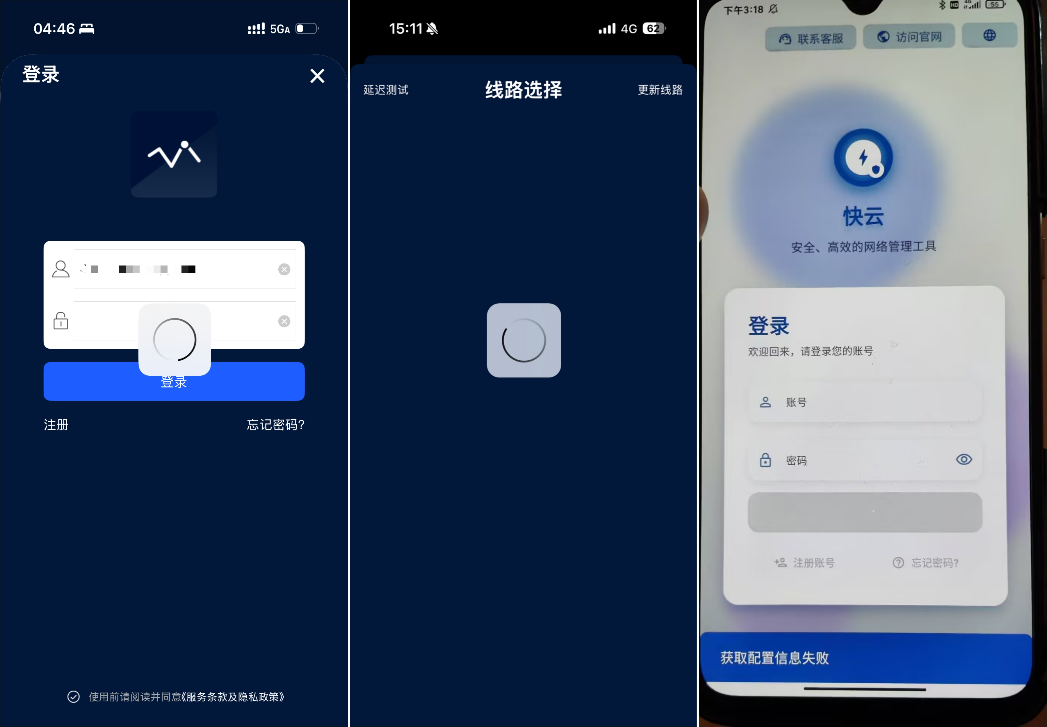 # ==问题①== #### 出现下面这三种情况 登录页面一直卡住 节点列表加载不出来 获取配置信息失败  ### 解决办法 更换其它加速软件使用 请看下面教程(什么设备看什么教程) <h2> [苹果手机使用教程](https://www.kuaiyundoc.com/doc/197/) --- [安卓手机使用教程](https://www.kuaiyundoc.com/doc/198/) --- [Win电脑使用教程](https://www.kuaiyundoc.com/doc/199/) --- [Mac电脑使用教程](https://www.kuaiyundoc.com/doc/200/) # ==问题②== ### 遇到节点超时 无法使用  ### 解决办法 先更新线路再测试延迟 如果更新失败 退出账号关掉App重新打开。重新登录再次更新线路测试延迟(如果不能使用联系客服寻求帮助)